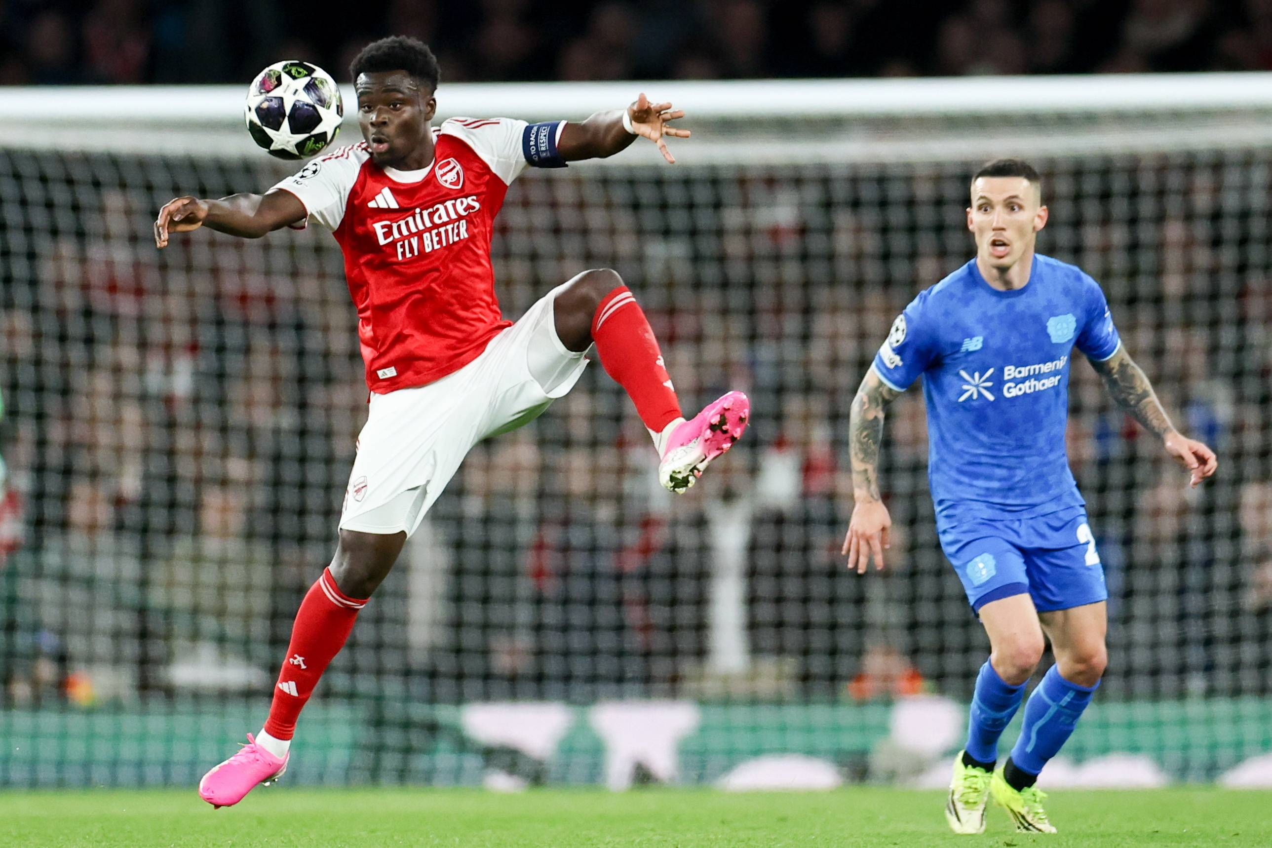 3月17日,阿森纳队球员萨卡(左)与勒沃库森队球员帕拉西奥斯拼抢。 新华社/欧新